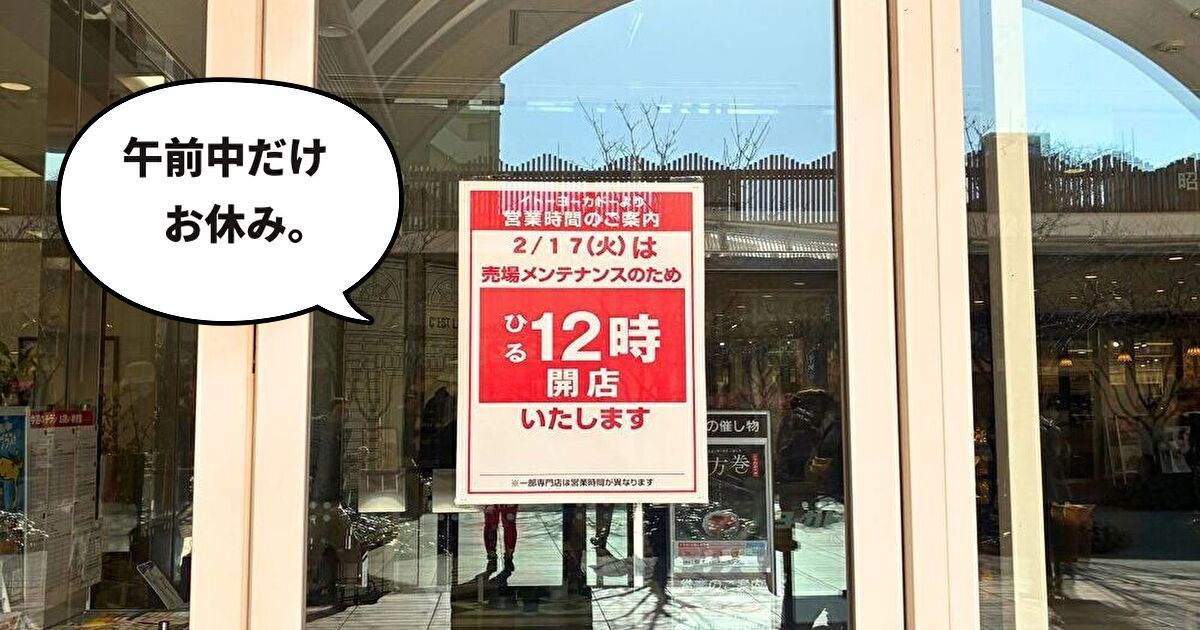 〖臨時休館〗2月5日(木)モリタウン専門店街が館内設備点検のため休館になるみたい。専門店街以外は通常営業