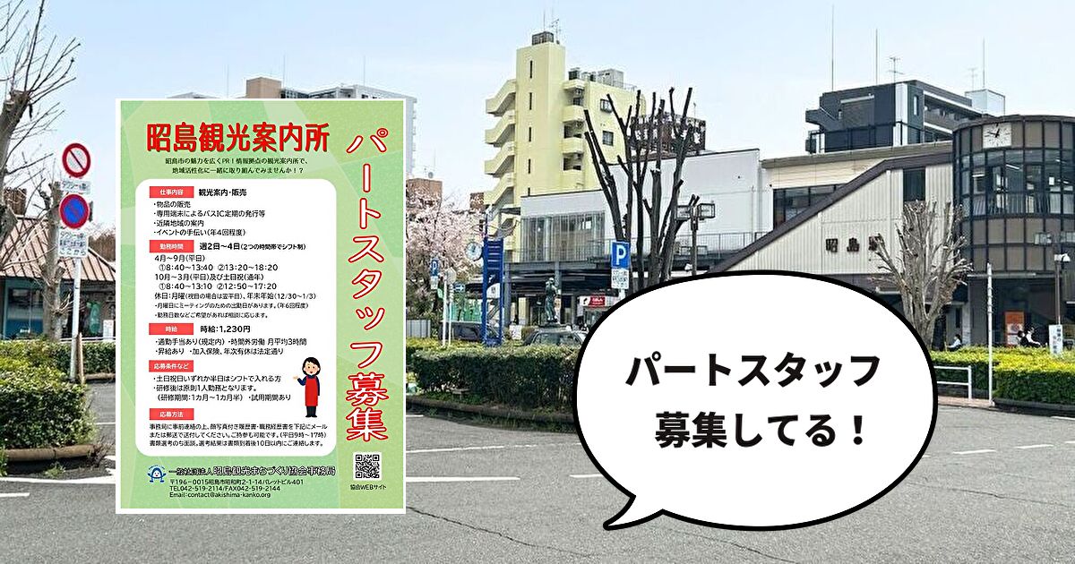 昭島の魅力を伝えるオシゴト!昭島駅北口の階段下にある『昭島観光案内所』がパートスタッフを募集してるみたい
