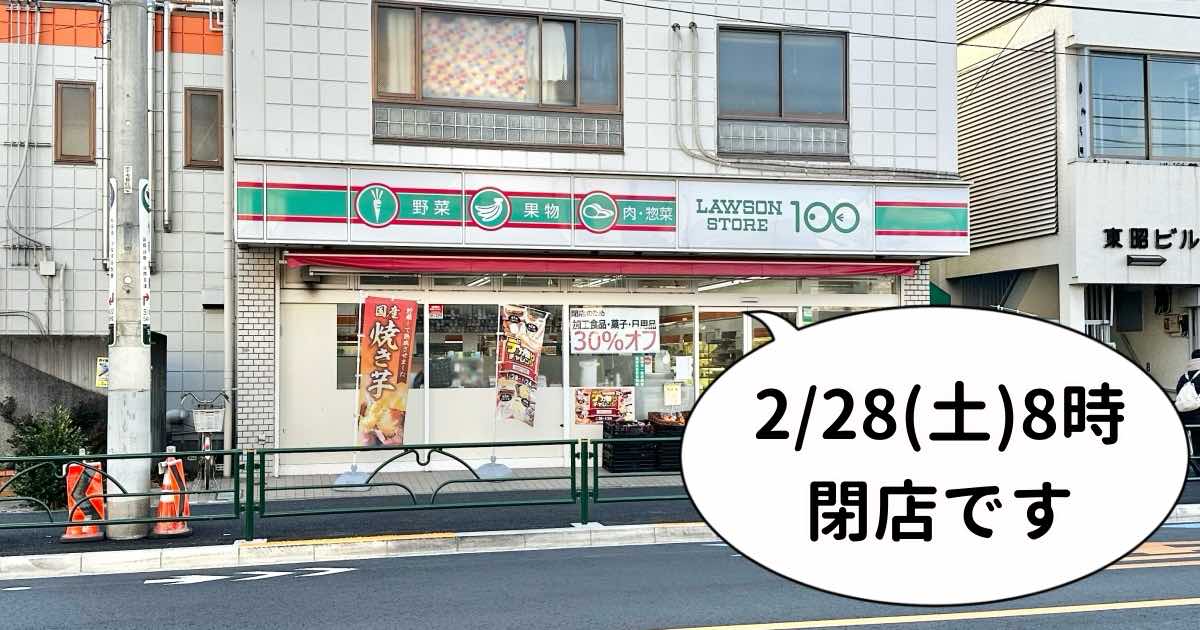 《閉店》江戸街道ぞいの『ローソンストア100 東中神店』が2月28日(土)8時で閉店するみたい。今なら加工食品・菓子・日用品が30%オフ