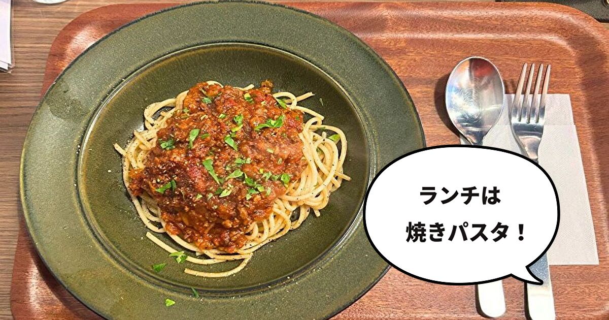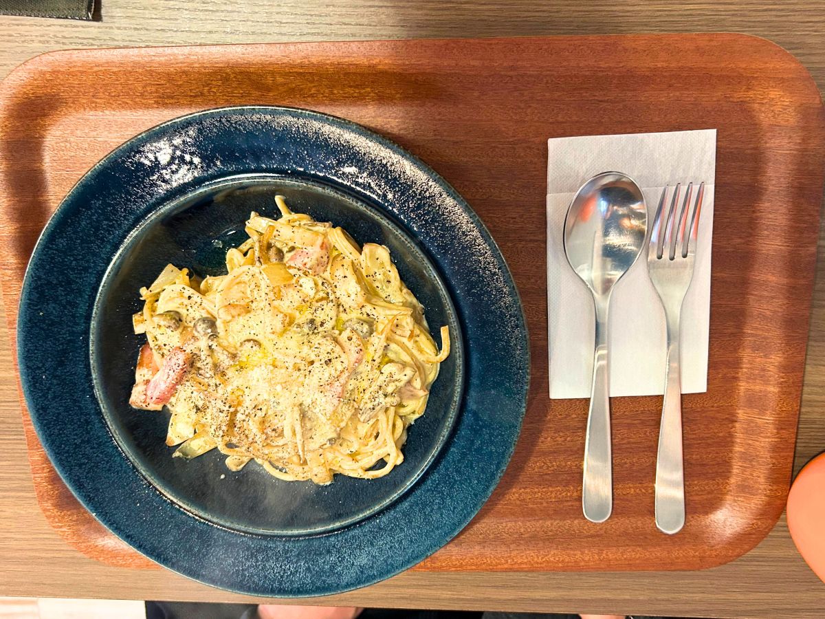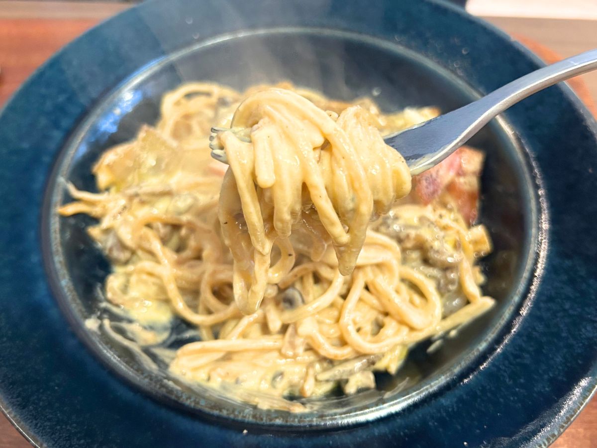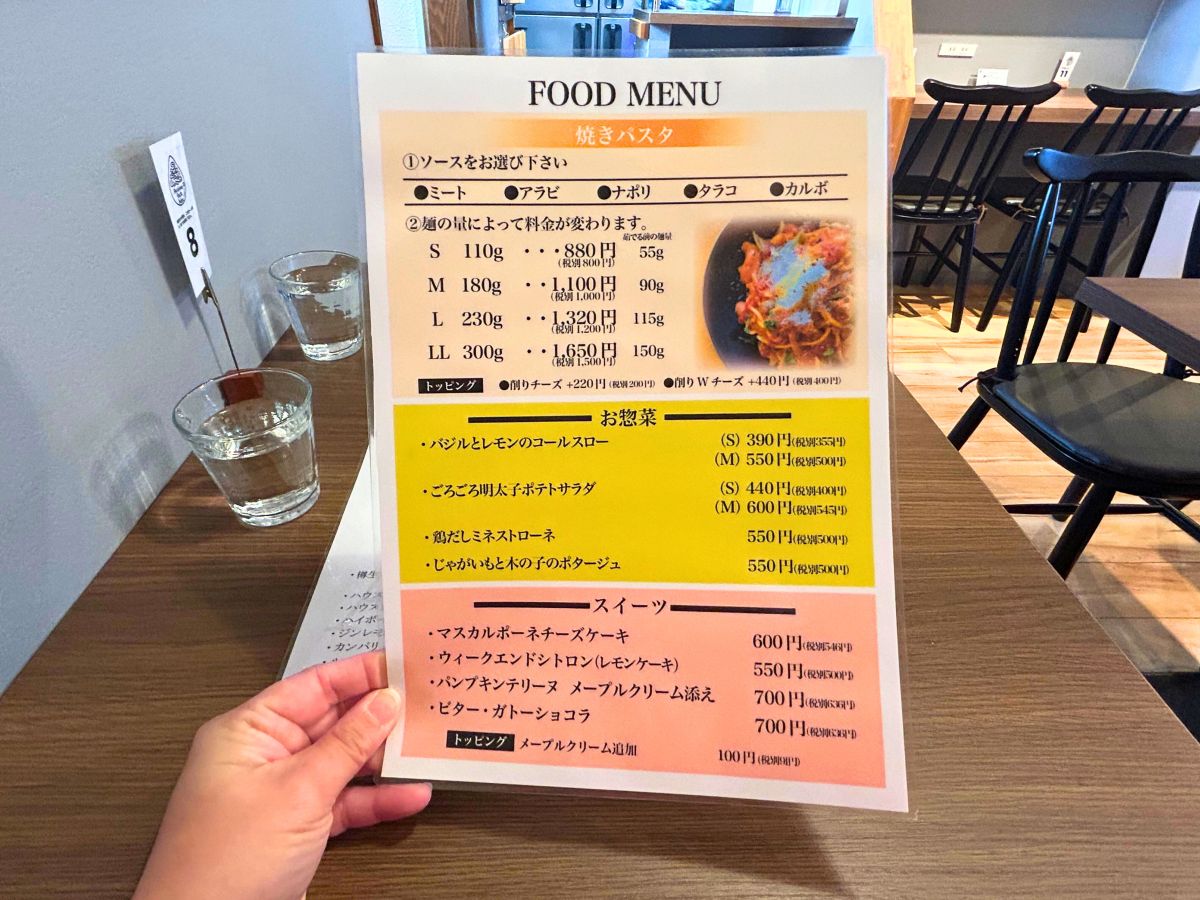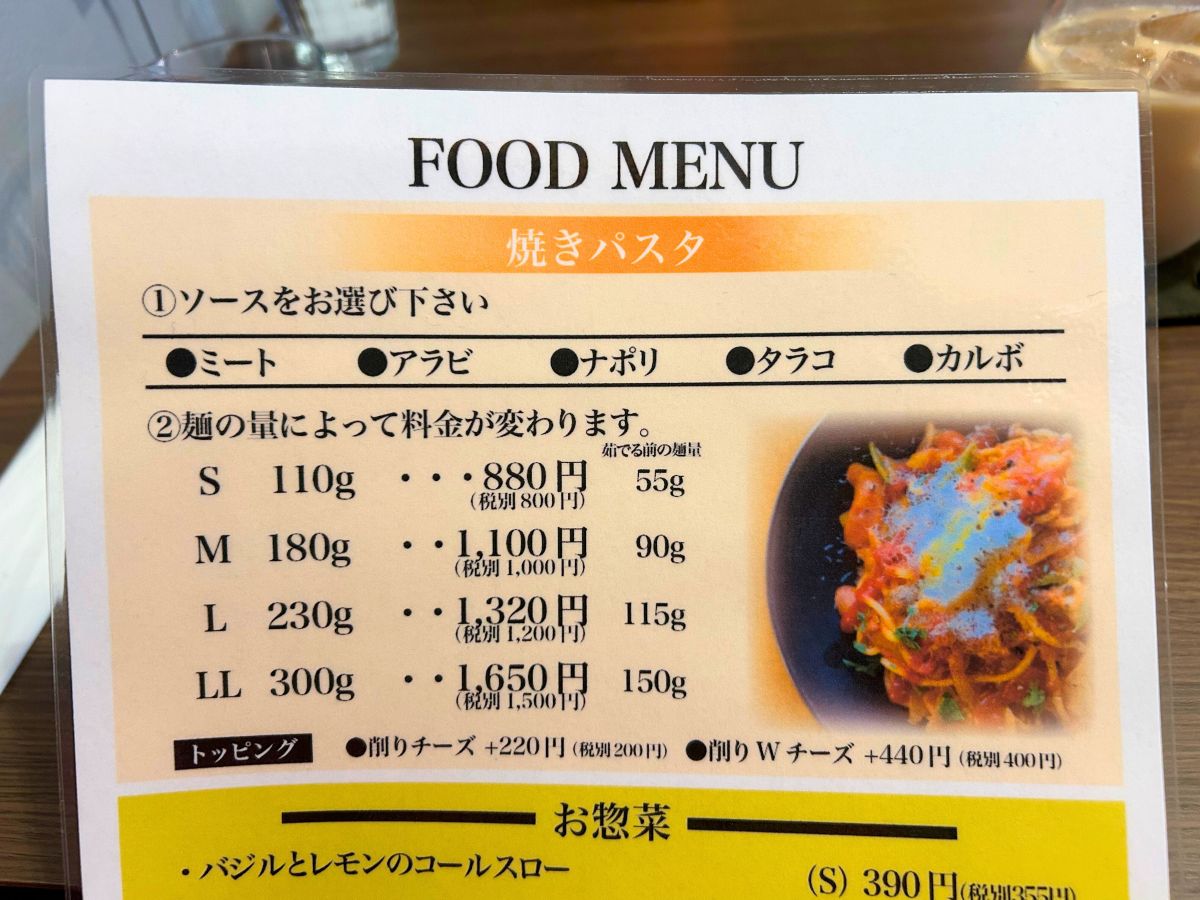 Mサイズが普通サイズだそうなので、焼きパスタMサイズ 1,100円のミートとカルボを注文します。
