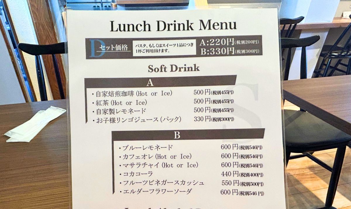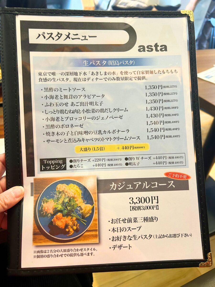 『昭島パスタ工房』では、昭島の水を使った生パスタのメニューが食べられると思っていたのですが、メニューになかったので店員さんに聞いてみると、ディナータイムで食べられるとのこと。