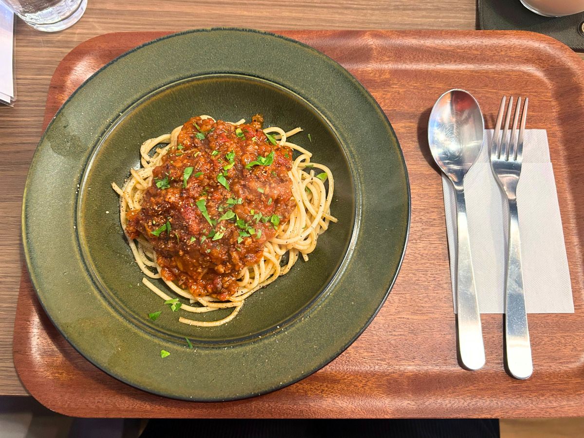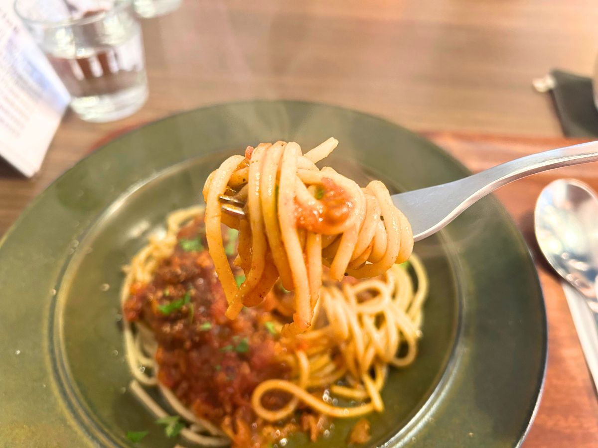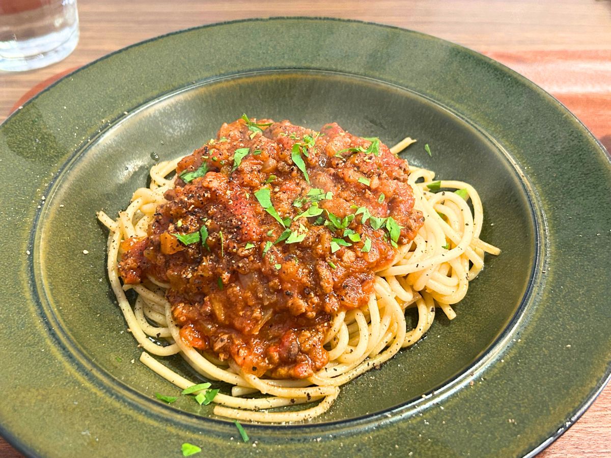 ミートソースはスパイシーで大人な味わい。焼いているので香ばしく、コクと深みがあります。