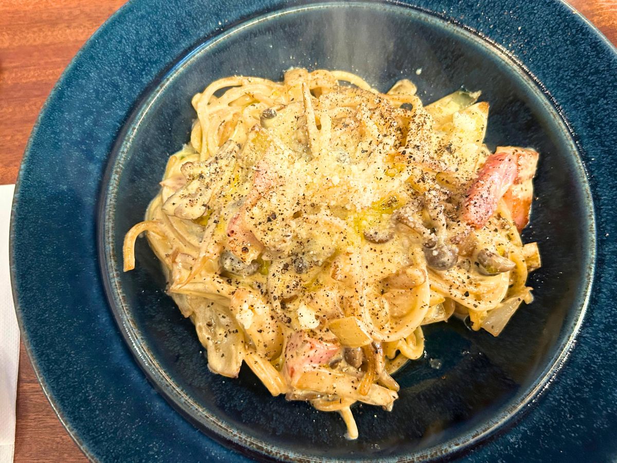 カルボナーラのクリーミーさの中にバター醤油を感じる。言うまでもない程に相性抜群です。
