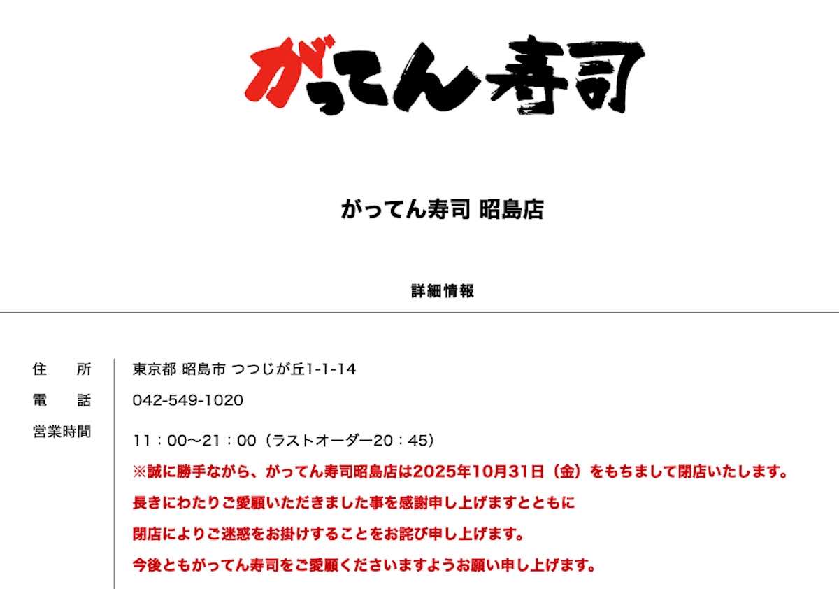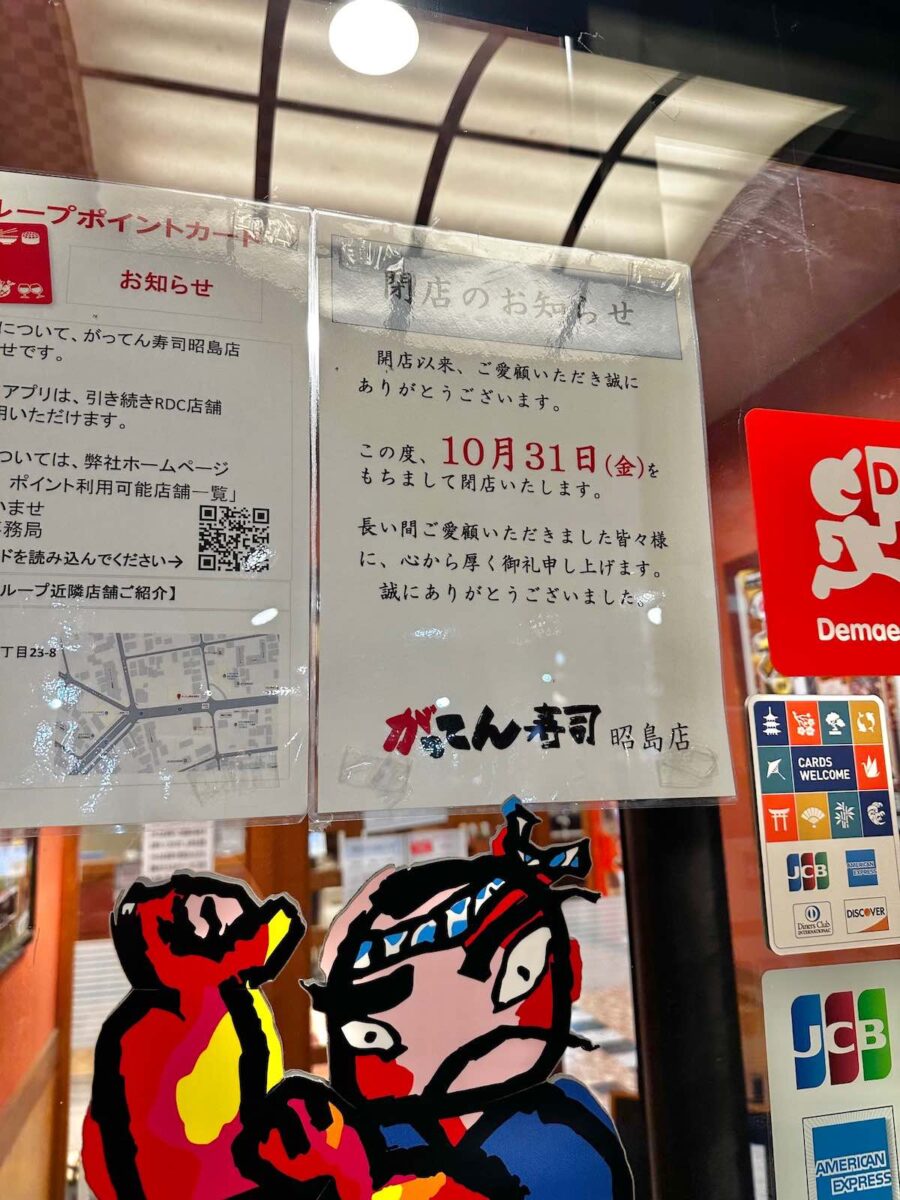 《閉店》『がってん寿司 昭島店』が10月31日(金)で閉店するみたい。諏訪松中通り沿いにあるチェーン店のお寿司屋さん。