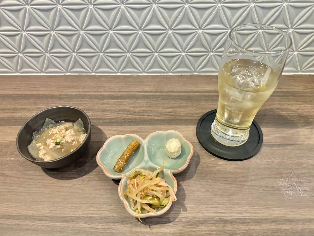 お通しはおばんざいのもやしのナムルごぼうの胡麻和えチーズちくわ、おまけでひき肉と大根の煮物