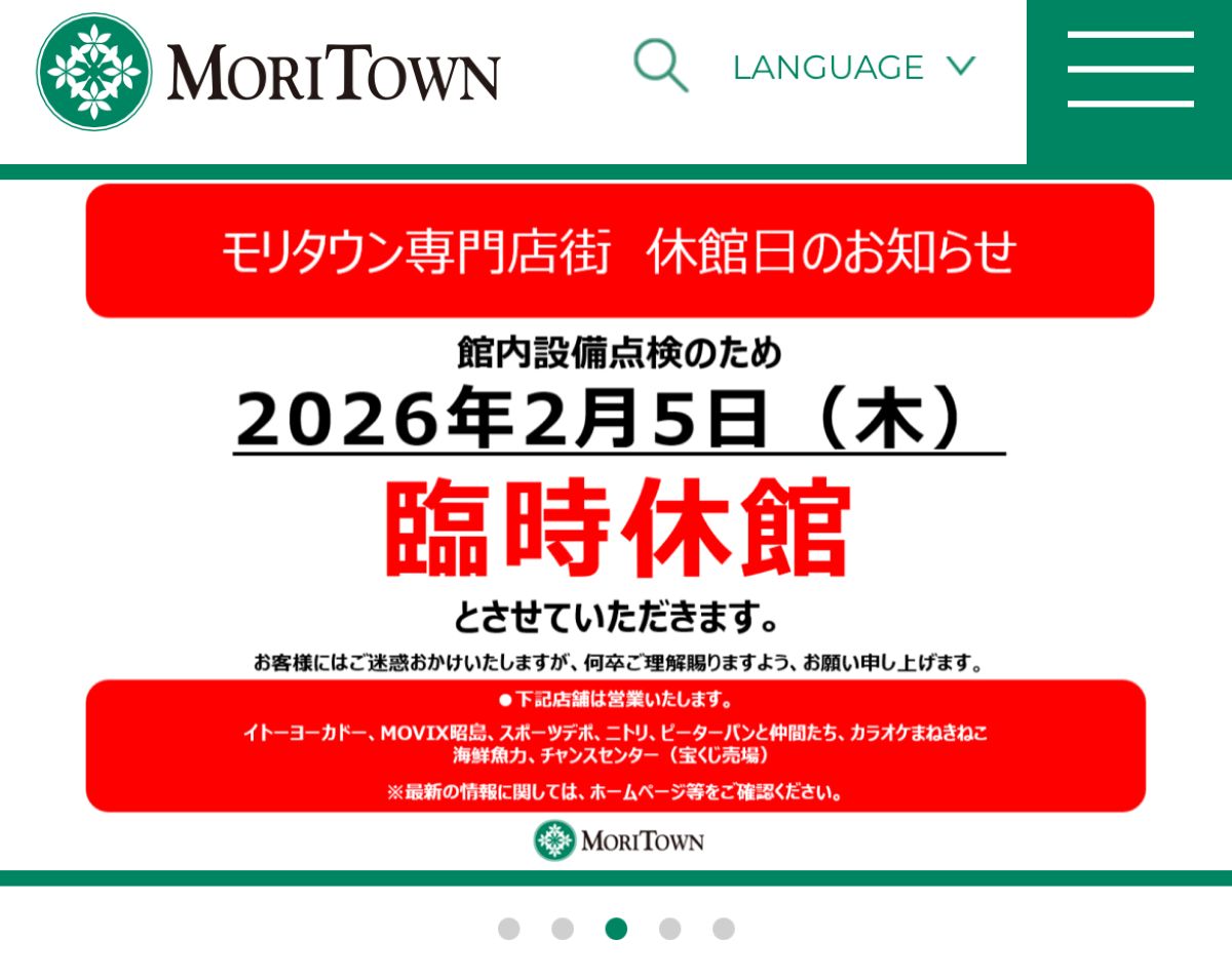 2月5日(木)は館内設備点検のため、モリタウン専門店街が臨時休館になるそうです。