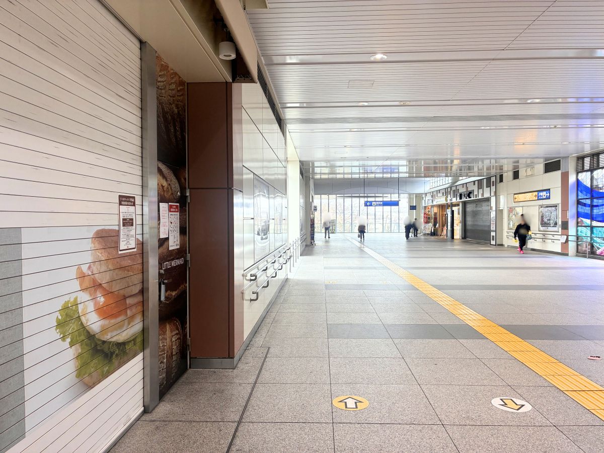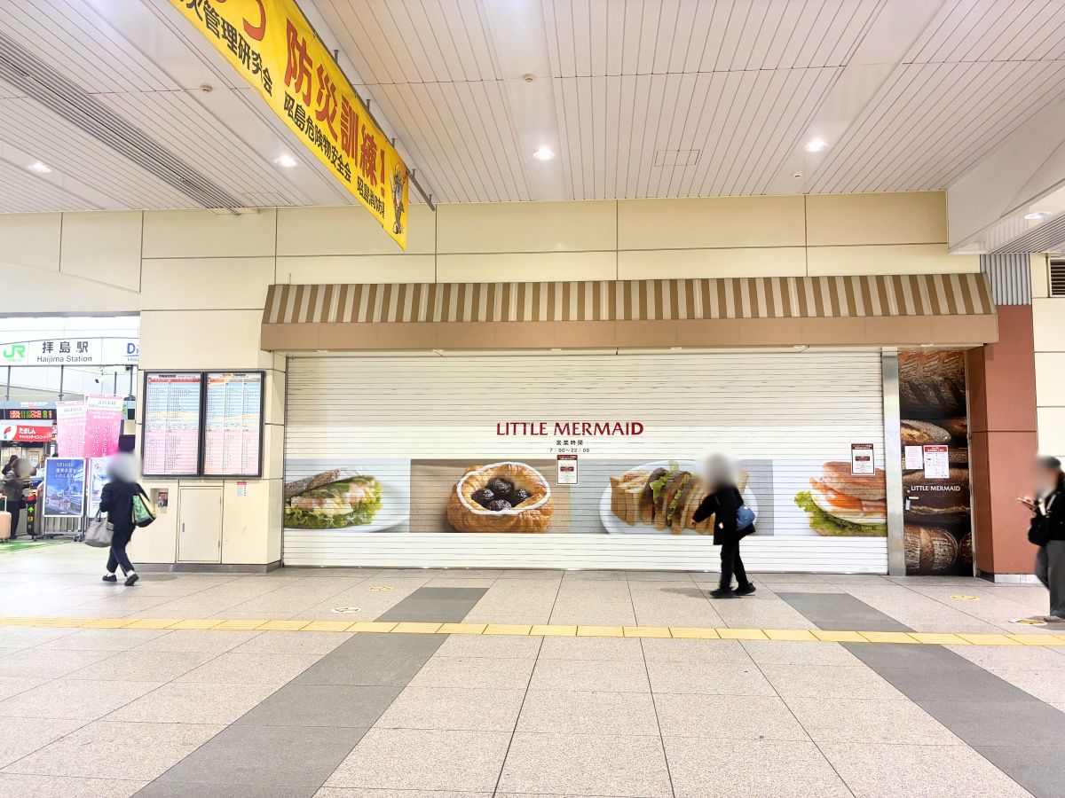 改札横にあるパン屋『リトルマーメイド 拝島店』のシャッターが閉まってる↓