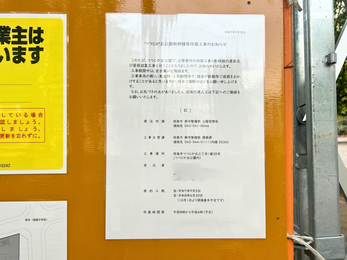 掲示板を見てみると、「つつじが丘公園新幹線等改築工事のお知らせ」が貼られています↓