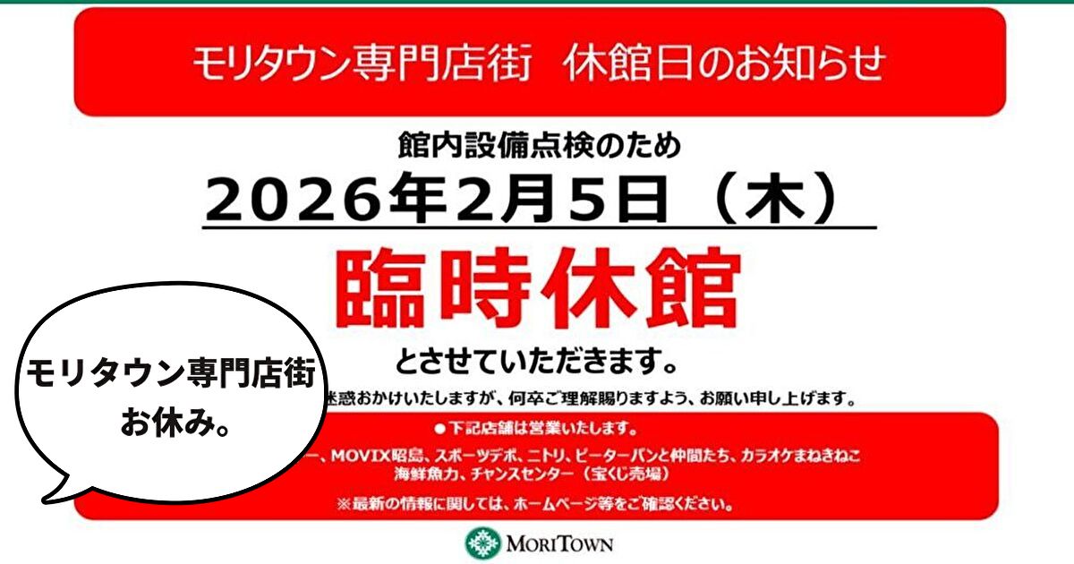 〖臨時休館〗2月5日(木)モリタウン専門店街が館内設備点検のため休館になるみたい。専門店街以外は通常営業
